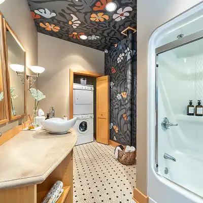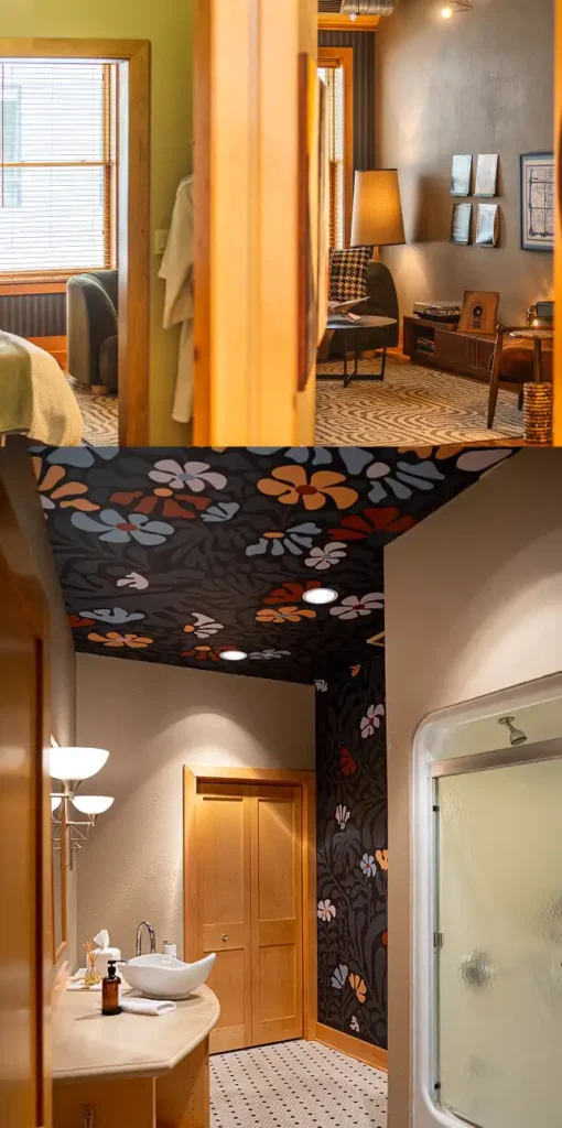 In the bathroom, we brought another concept to life: A high-contrast floral pattern that climbs from the wall onto the ceiling. The surprise of that ceiling treatment elevates the small space in a big way—adding art and edge to an otherwise utilitarian room.