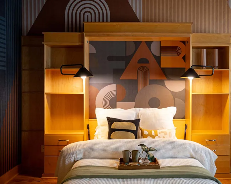 The color palette was drawn from mid-century and Scandinavian influence, but grounded in earth tones to honor the building’s warmth and patina. We printed the design as custom wallcovering for the headboard accent wall and built the surrounding interiors around it—creating a space that feels graphic, intentional, and undeniably Fargo.